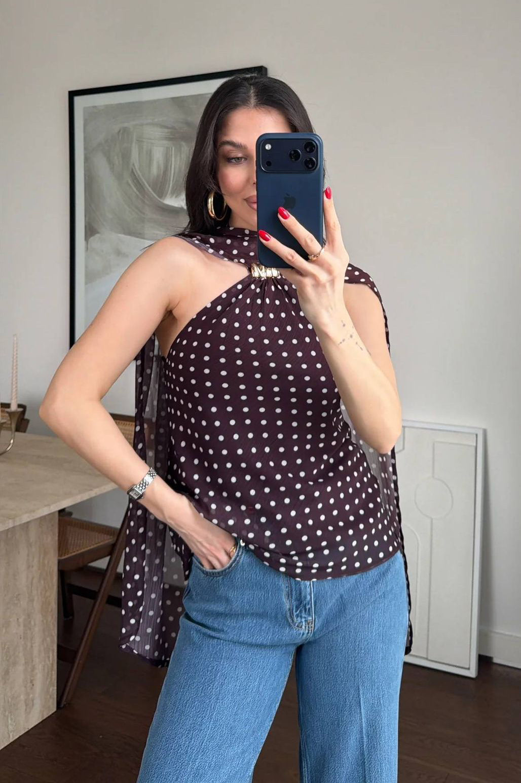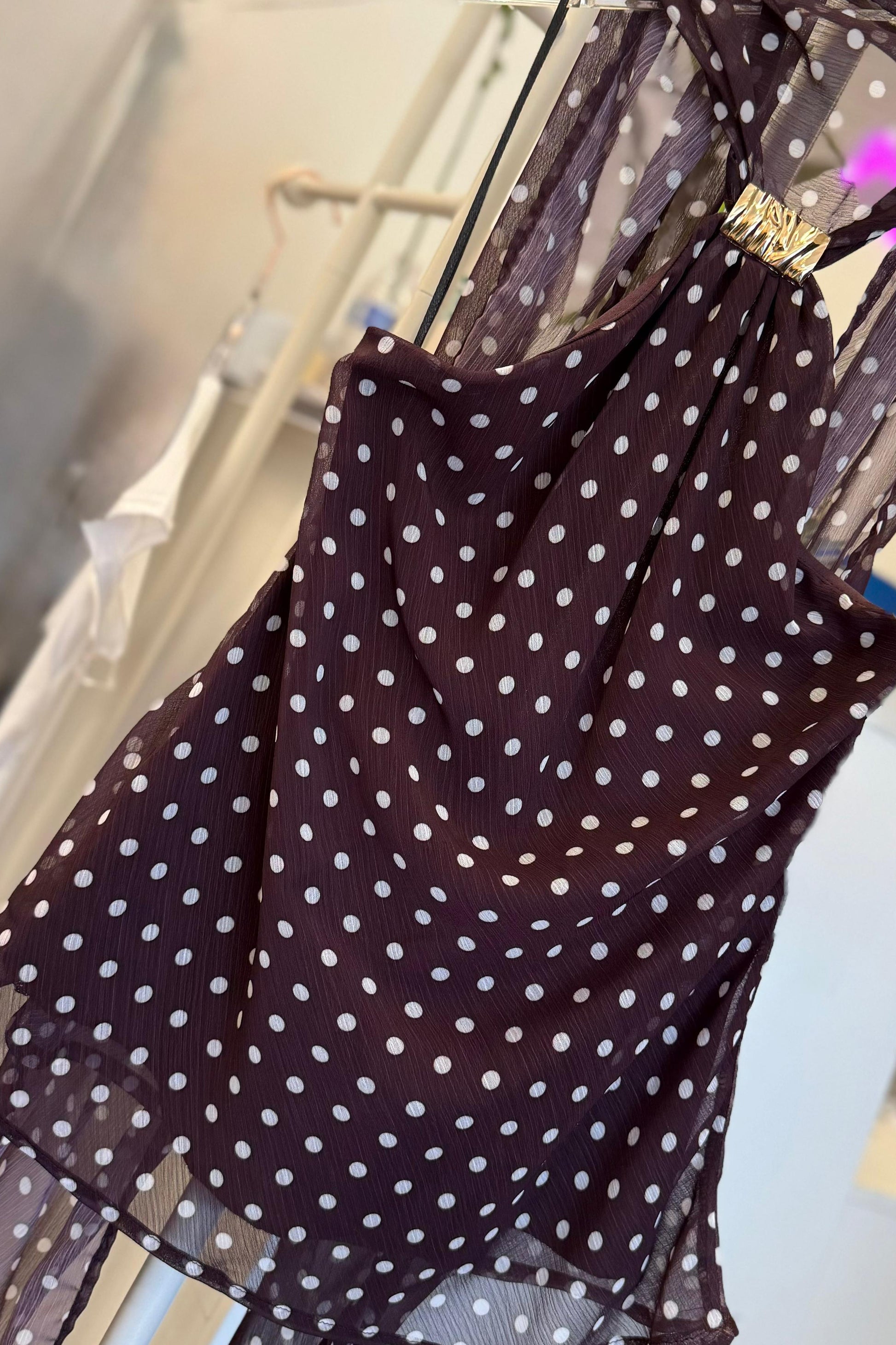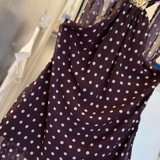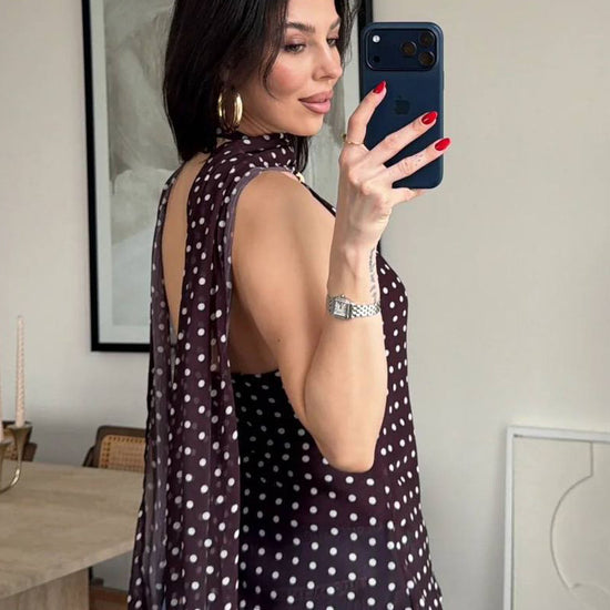 Con escote halter y detalle metálico dorado al frente, estiliza los hombros y alarga visualmente la silueta. Su tela ligera y con movimiento crea una caída hermosa, mientras el estampado de lunares clásicos la convierte en un básico con personalidad.