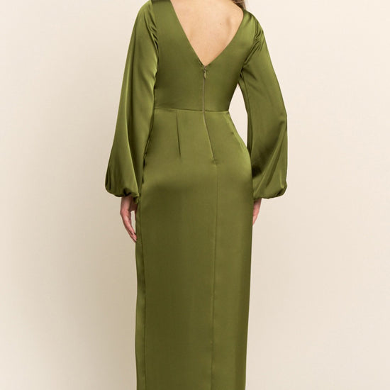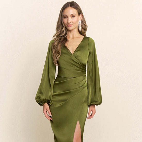 Vestido largo cruzado de satin con cuello en V y manga larga