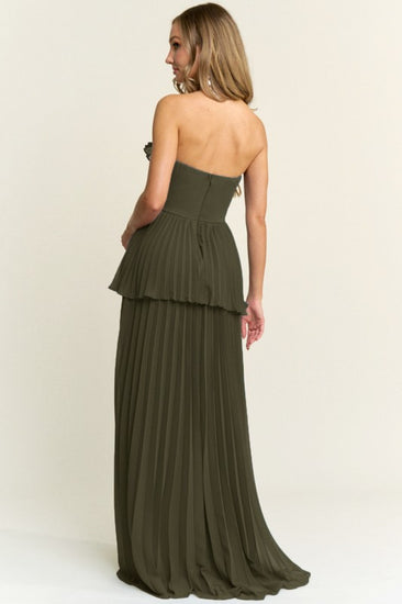 Vestido largo strapless plisado verde olivo